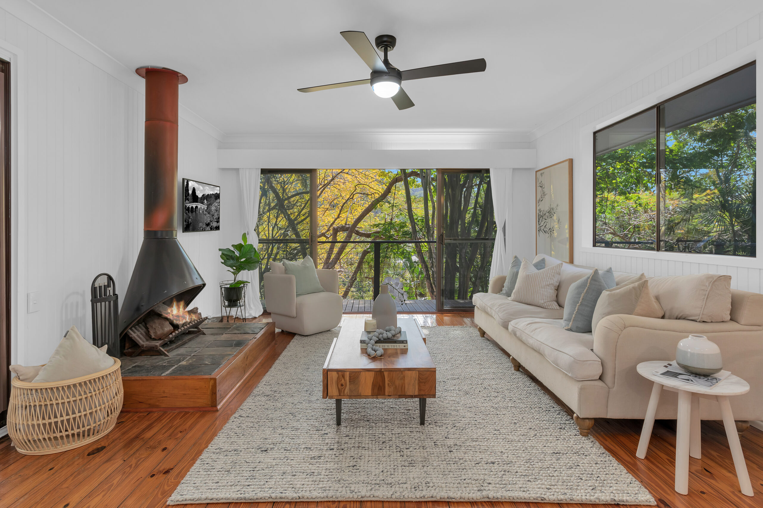 * Central living area with direct access to outdoor wrap-around entertainer’s deck, leafy green views and wood burning fireplace.